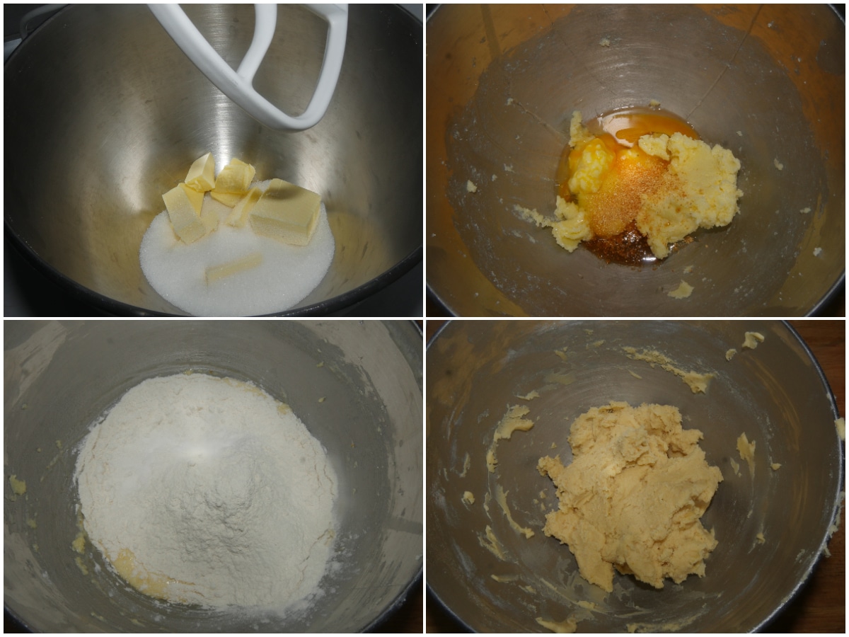 Preparate la pasta frolla: lavorate il burro con lo zucchero, poi incorporate prima uova e vaniglia e infine farina e bicarbonato.