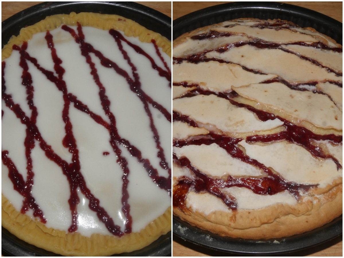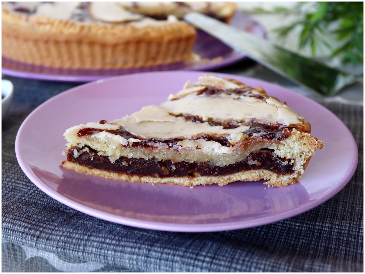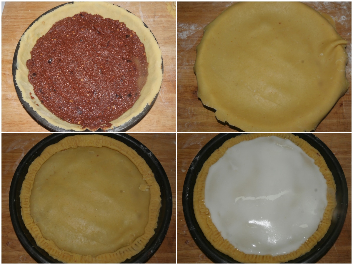 Mettete la farcia nel guscio di frolla e livellate la superficie, poi coprite con la frolla restante e pareggiate e sigillate i bordi, infine coprite con la glassa, lasciando liberi solo i bordi.