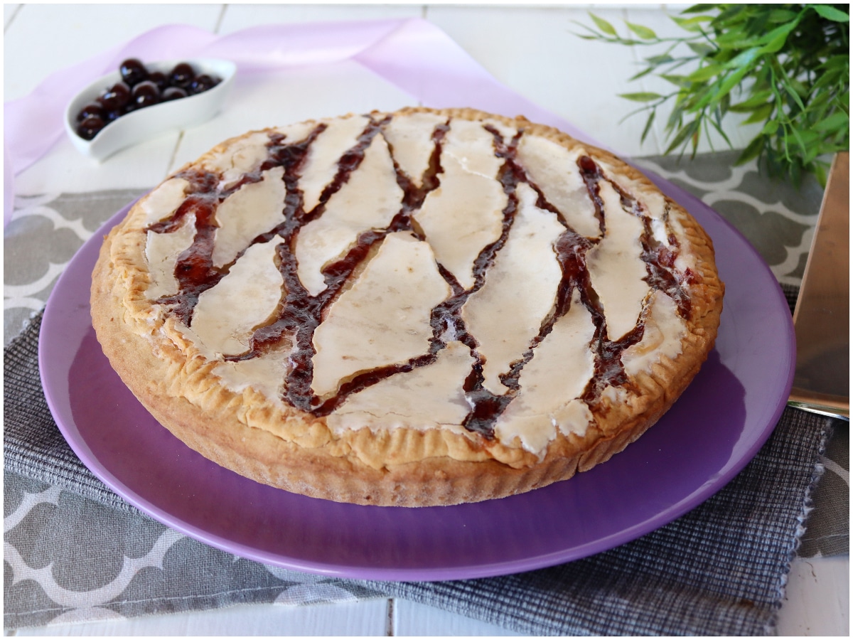 La crostata biscotto amarena è, come si evince dal nome, la versione grande del classico biscotto all'amarena. Per chi non lo sapesse, è una ricetta tipica della pasticceria napoletana, nata come idea riciclo per sfruttare tutti gli avanzi di altri dolci, che venivano sminuzzati e impastati tra loro usando la marmellata di amarene come legante. Si tratta di un dolcetto molto amato qui in Campania, fa parte della nostra tradizione, e io ho pensato di portare un pizzico di innovazione creando questa variante, non più monoporzione, ma grande, da tagliare a fette. Devo dire che il risultato mi è piaciuto molto, ma se la provate fatemi sapere cosa ne pensate anche voi, naturalmente ;)