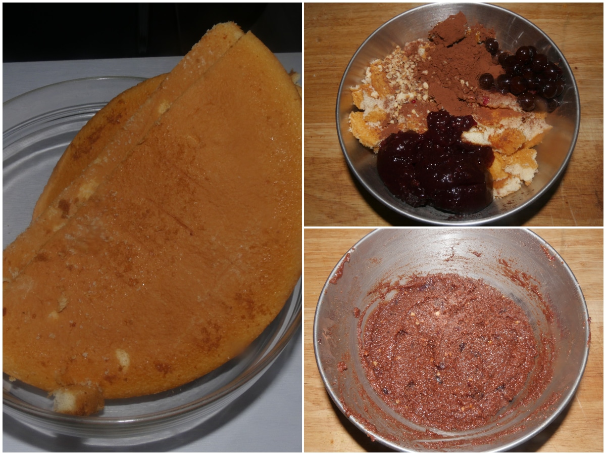 Preparate la farcia: sbriciolate pan di Spagna e biscotti in una ciotola, aggiungete marmellata e amarene sciroppate e amalgamate, cercando di creare un composto uniforme.