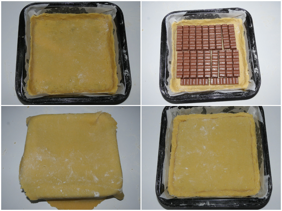 Stendete anche la seconda parte di pasta frolla e usatela per coprire le barrette, sigillando i bordi con la frolla di sotto.