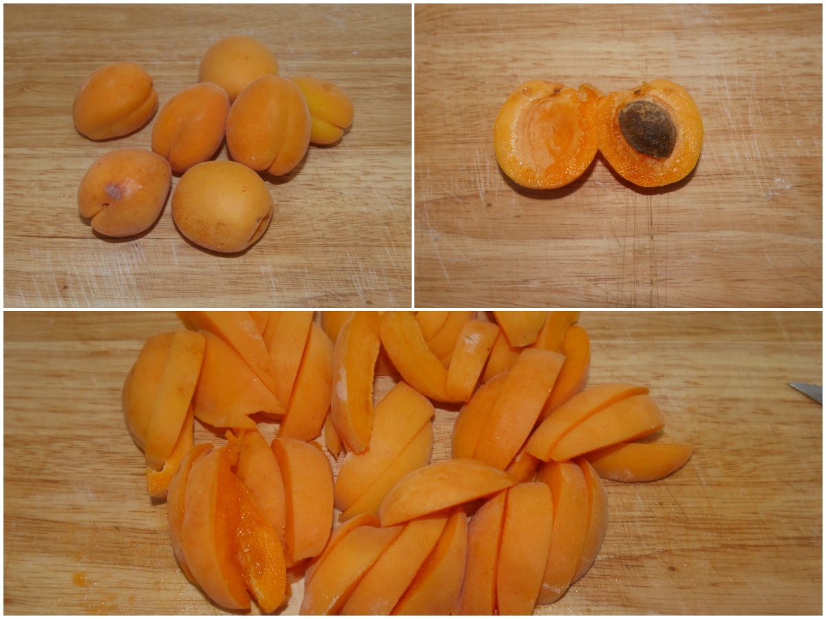 Lavate bene le albicocche, asciugatele e dividetele a metà, per eliminare il nocciolo, poi tagliate ogni metà in 4 spicchietti.