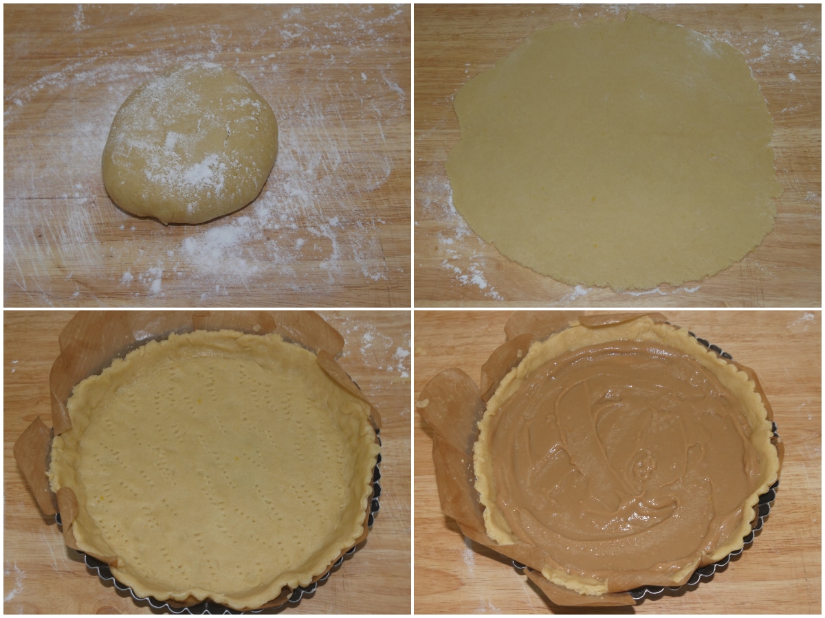 Passato il riposo, stendete la frolla in una sfoglia sottile, usatela per foderare fondo e bordi dello stampo (che avrete precedentemente imburrato e infarinato oppure, come me, rivestito di carta forno), bucherellate il fondo e copritelo con la crema ormai fredda, livellando la superficie.