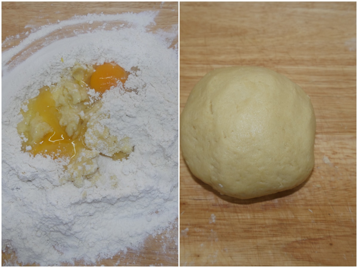 Innanzitutto unite tutti gli ingredienti per la frolla in una ciotola (o direttamente sul piano di lavoro, come ho fatto io) e lavorate velocemente fino ad ottenere un panetto omogeneo, quindi coprite con pellicola per alimenti e fate riposare in frigo per almeno 1 ora.