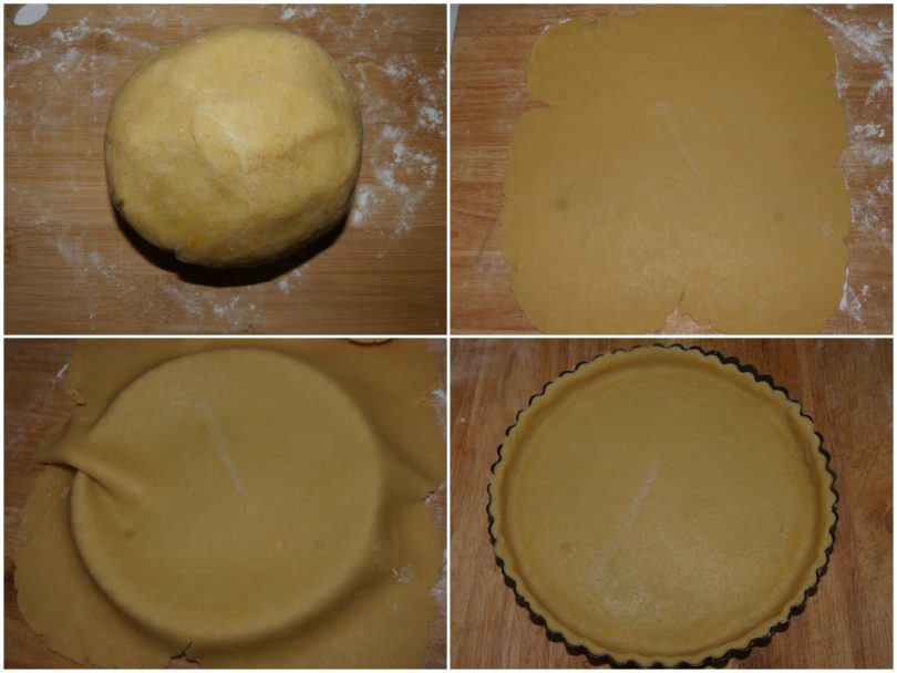 Una volta trascorso il tempo di riposo, riprendere la pasta frolla e stendeteta su un piano infarinato. Imburrate uno stampo per crostate e adagiate lo strato di pasta frolla.