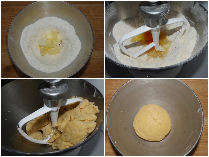 Disponete la farina e lo zucchero a fontana su un ripiano o in un'ampia ciotola e mettetevi nel mezzo il burro ammorbidito e impastare fino ad ottenere un composto granuloso. Poi unite le uova, e la buccia di limone.