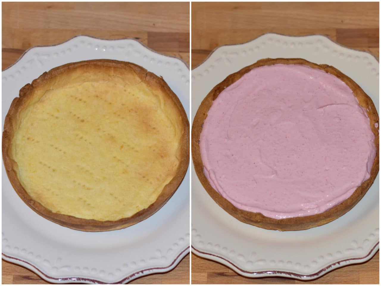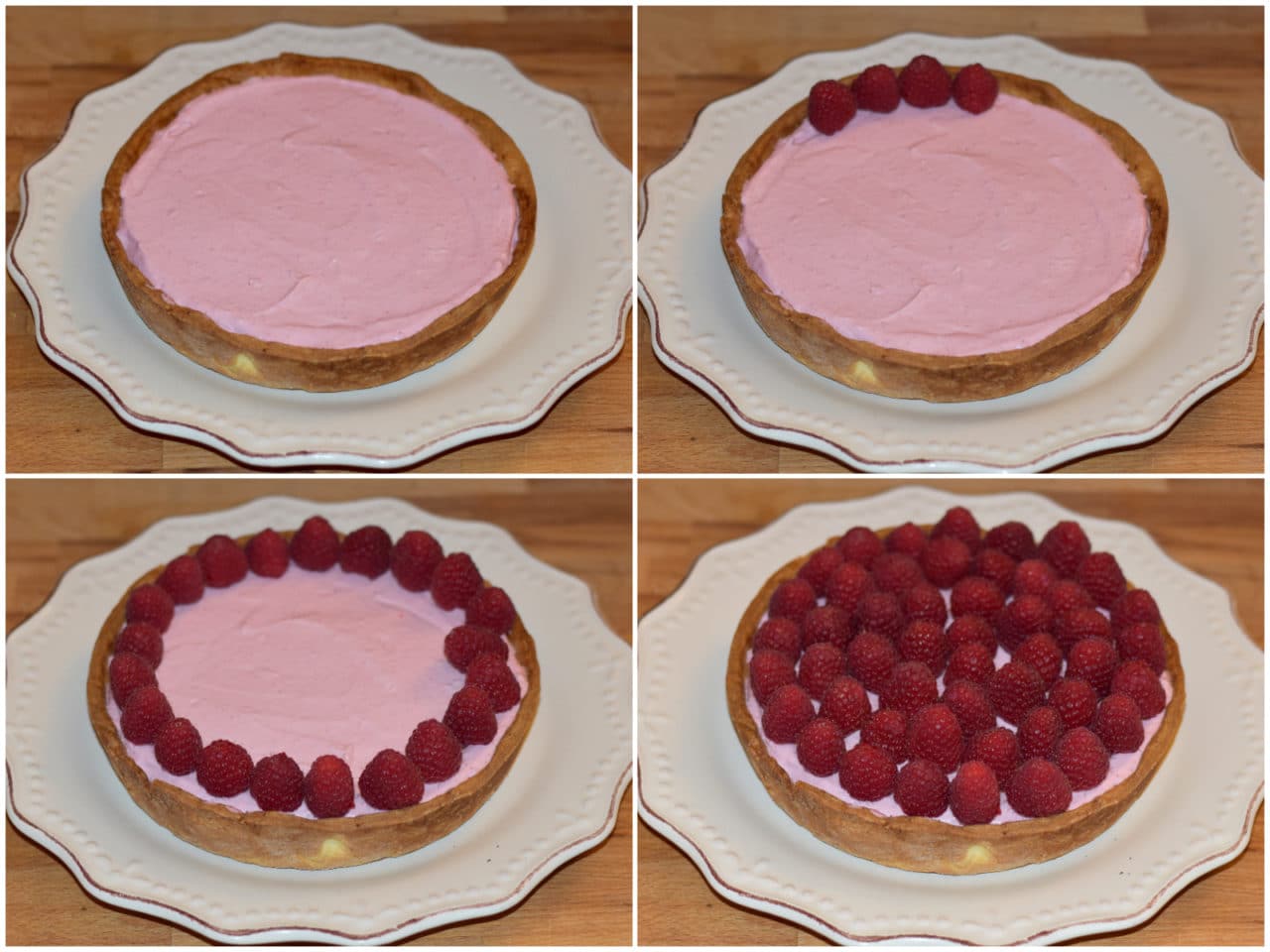 Assemblate la crostata: disponete la base su di un piatto da portata, versateci dentro la crema e livellate bene la superficie, poi decorate con i lamponi freschi rimasti (i 250 gr).