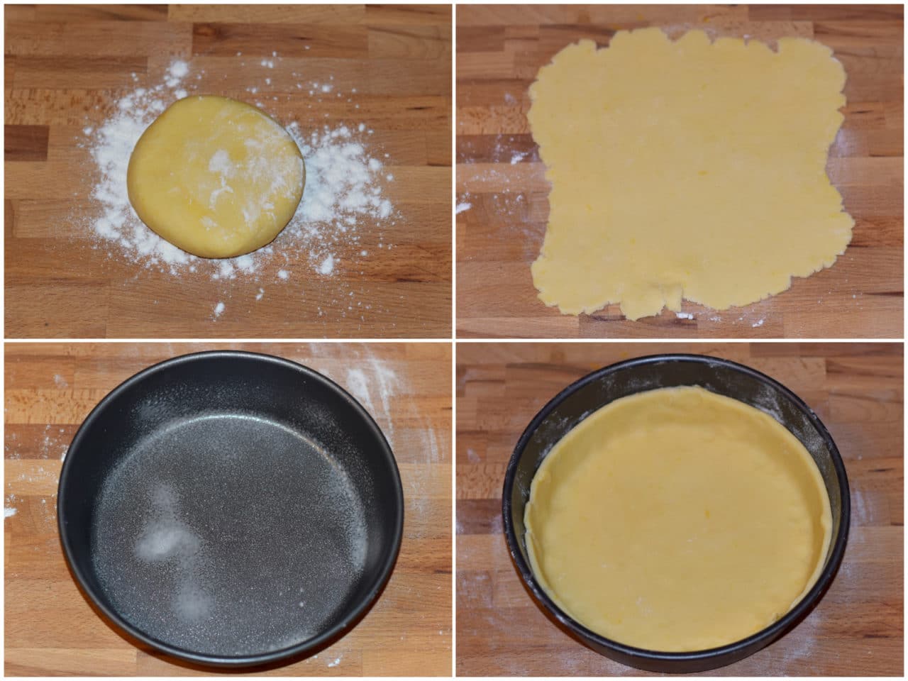 Riprendete il panetto e stendetelo in una sfoglia sottile (circa 0,5 cm), quindi adagiatela nello stampo imburrato e infarinato e pareggiate i bordi.