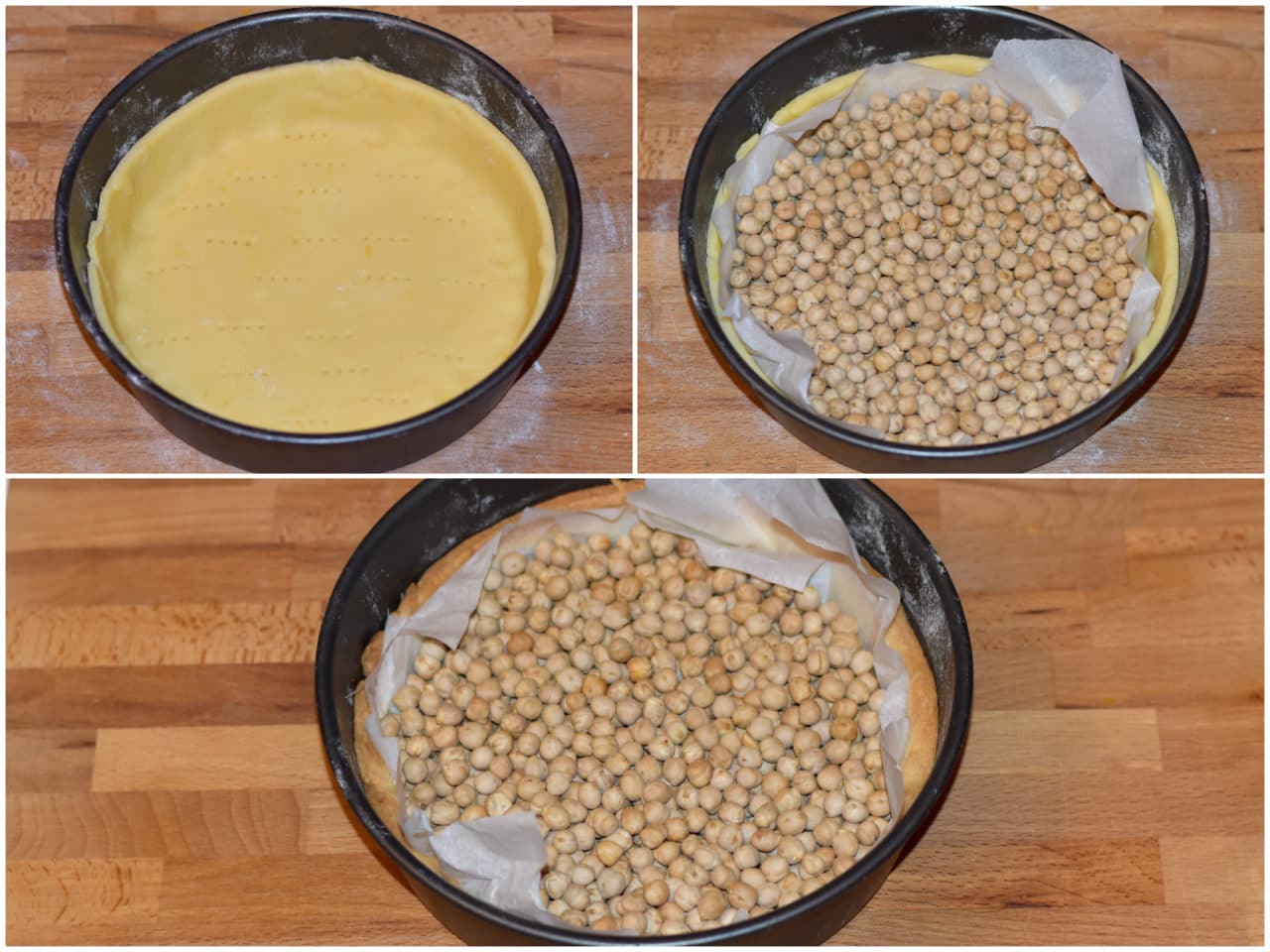 Bucherellate il fondo con i rebbi di una forchetta e procedete con la cottura in bianco: coprite con un foglio di carta forno e poi con legumi secchi, quindi cuocete per circa 30 minuti in forno statico preriscaldato a 180°C.