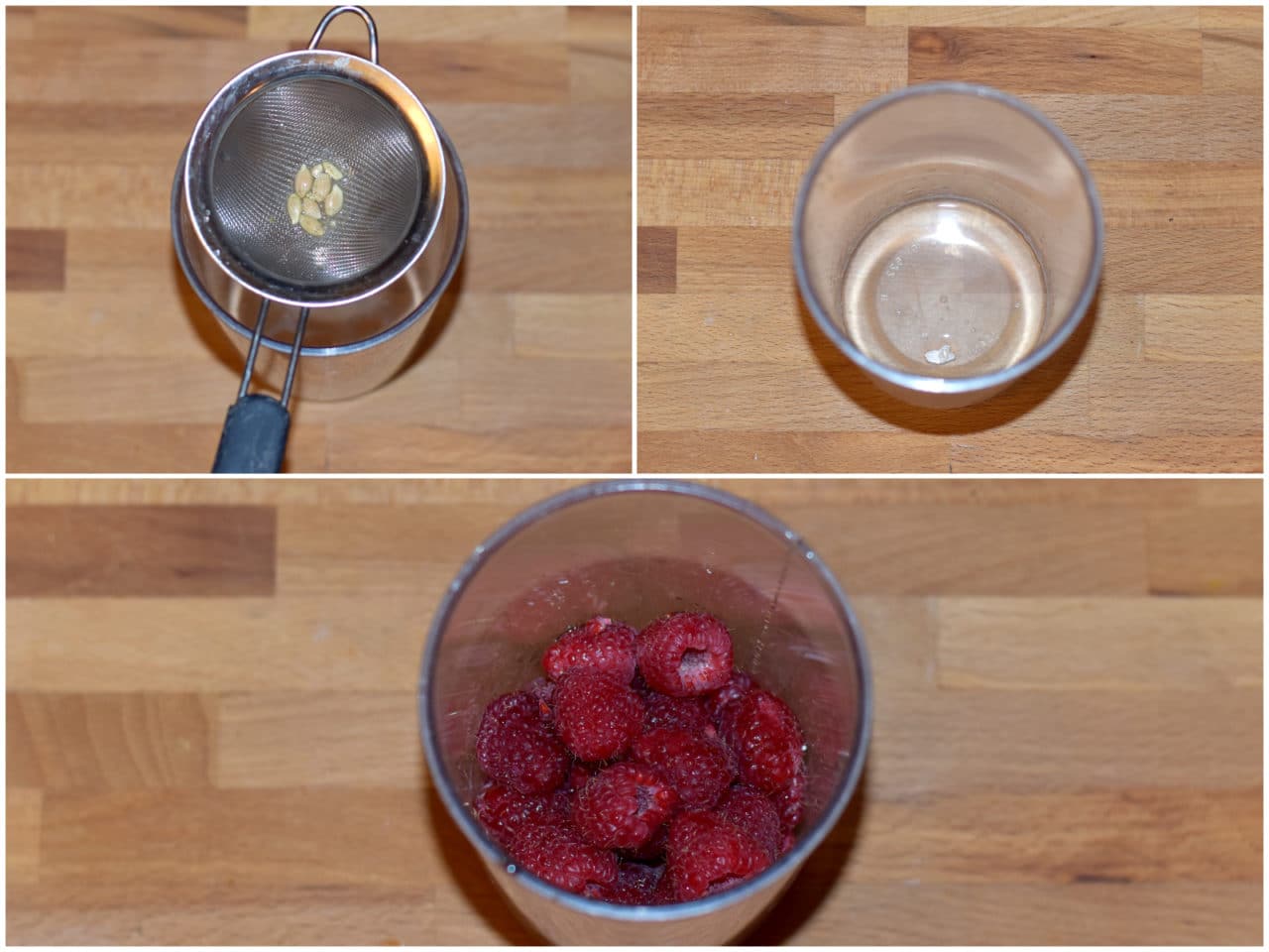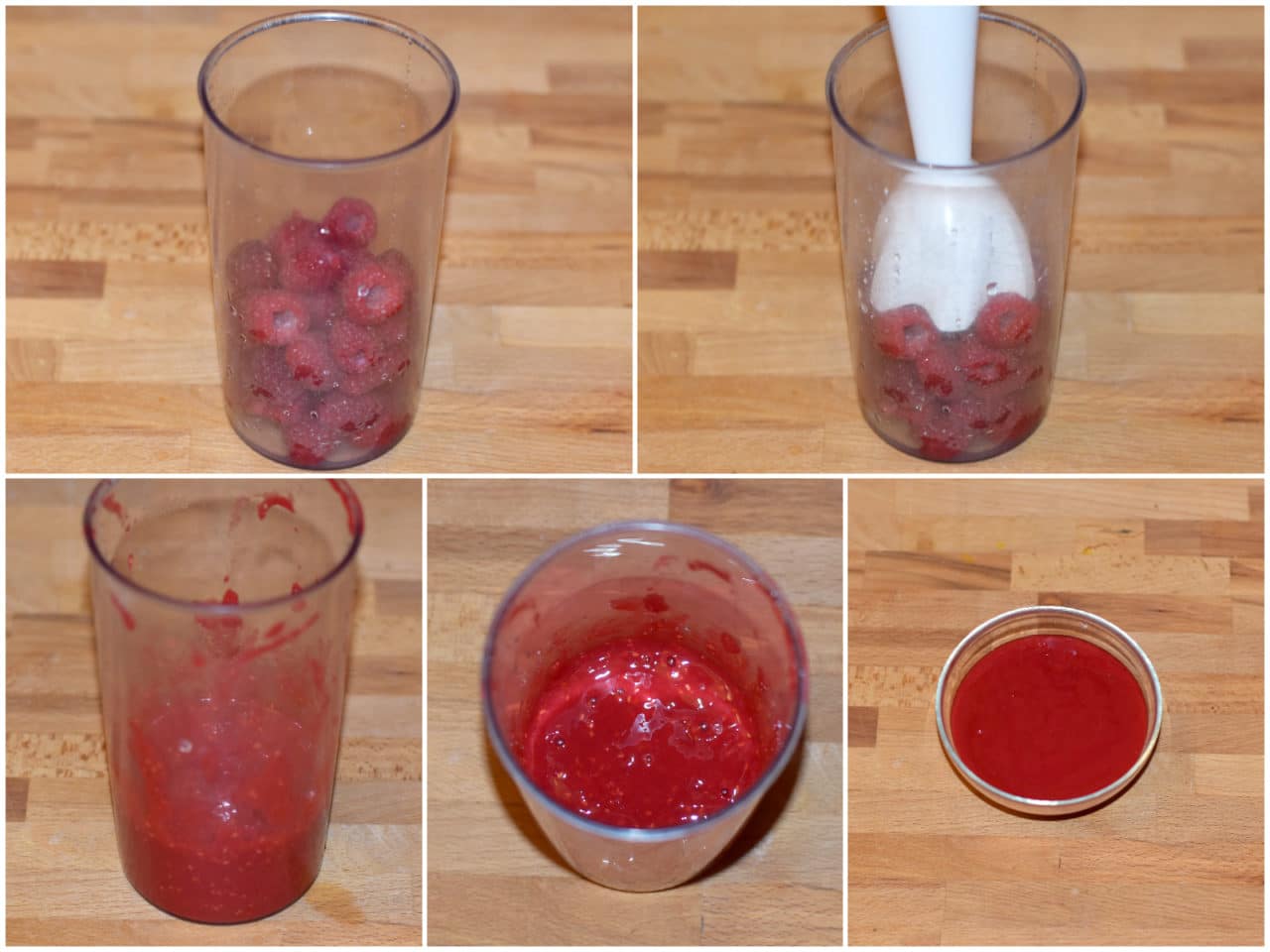 Mettete lamponi (200 gr) e limone in un contenitore adeguato e frullate con il minipimer, quindi filtrate nuovamente.