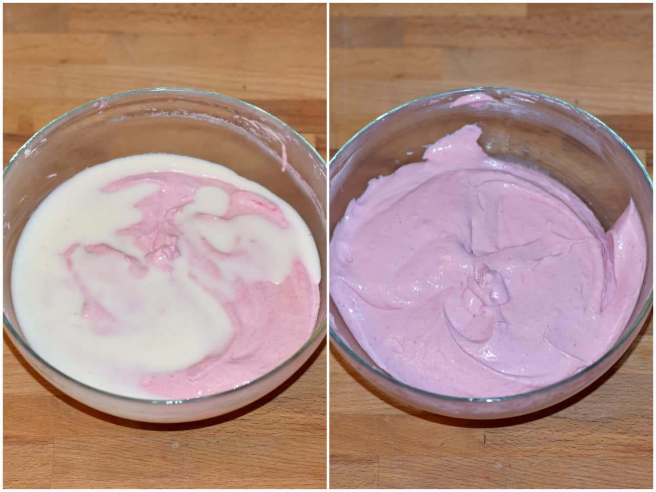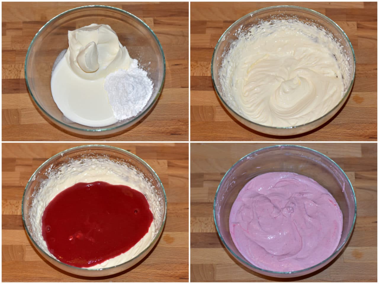Unite in una ciotola mascarpone, 75 gr di panna e zucchero e montate con le fruste fino ad ottenere un composto omogeneo, quindi incorporate anche la purea di lamponi e mescolate.
