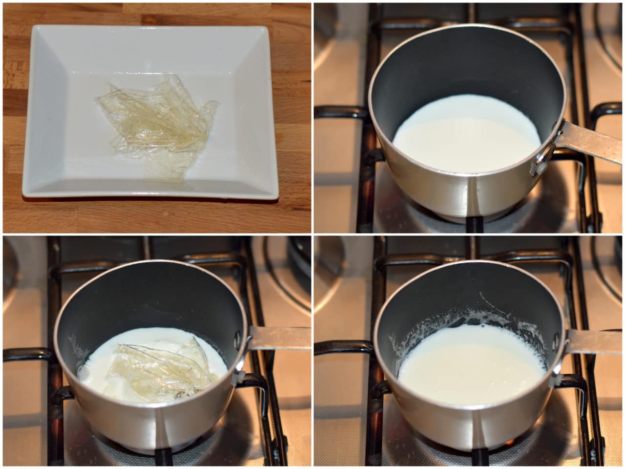 Iniziate a preparare la crema per la farcitura: mettete la colla di pesce in ammollo in acqua fredda.