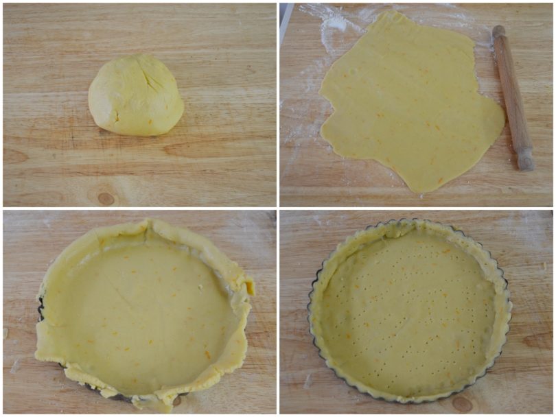 Riprendete la pasta frolla e, su un piano infarinato, con l'aiuto di un mattarello, stendetela con il mattarello ad uno spessore di circa 4 mm. Foderate uno stampo da crostata da 22 cm imburrato e infarinato. Fate aderire bene i bordi allo stampo e tagliate via la pasta in eccesso. Bucherellate il fondo della crostata con la forchetta