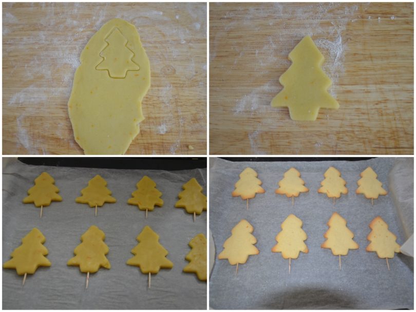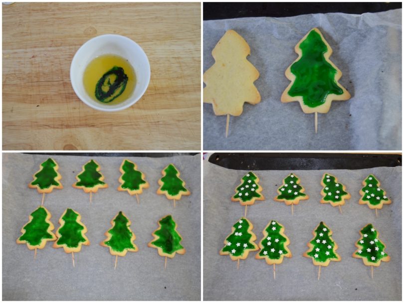 Mettete i biscotti su una teglia coperta di carta forno, quindi inserite uno stuzzicadente in ogni alberello facendolo uscire per circa 2 cm.