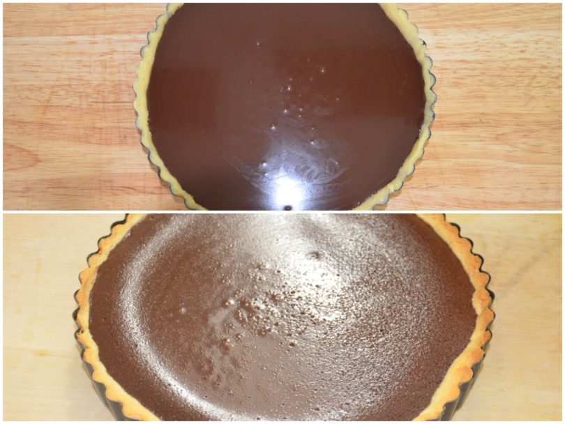 Versate la crema al cioccolato fredda nel guscio di pasta frolla quindi infornate la crostata in forno già caldo a 180 °C e cuocete per 30 minuti. Una volta cotta sfornate la crostata al cioccolato e lasciatela raffreddare.