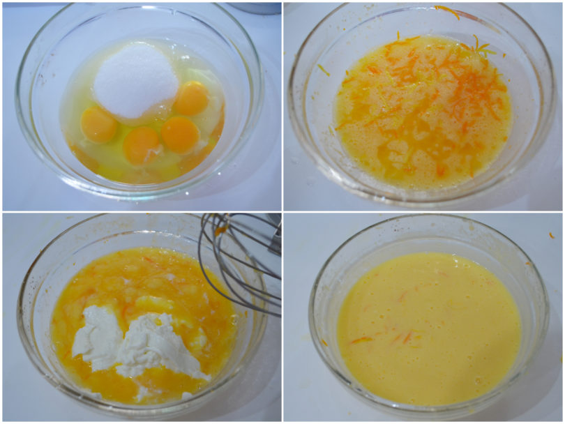 Nel frattempo preparate la farcia: sbattete insieme uova e zucchero (senza montarle), quindi unite succo e buccia grattugiata degli agrumi e lo yogurt e amalgamate.