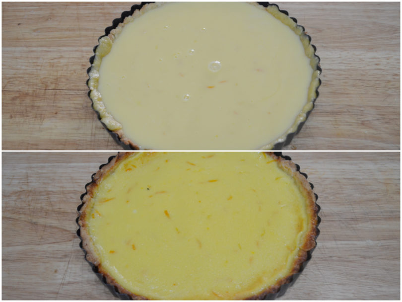 Versate la crema nel guscio di frolla, rimettete in forno e cuocete ancora per 30 minuti o finché la crema non sarà ben compatta.