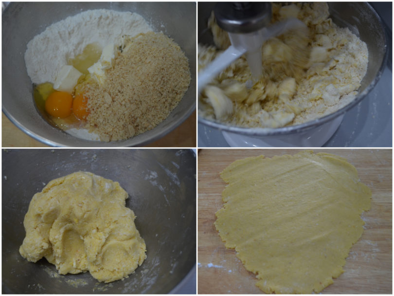 Iniziate preparando la frolla: mettete tutti gli ingredienti (farina, nocciole, lievito, vaniglia, burro, zucchero, sale e uova) in una ciotola e amalgamate fino ad ottenere un panetto omogeneo.