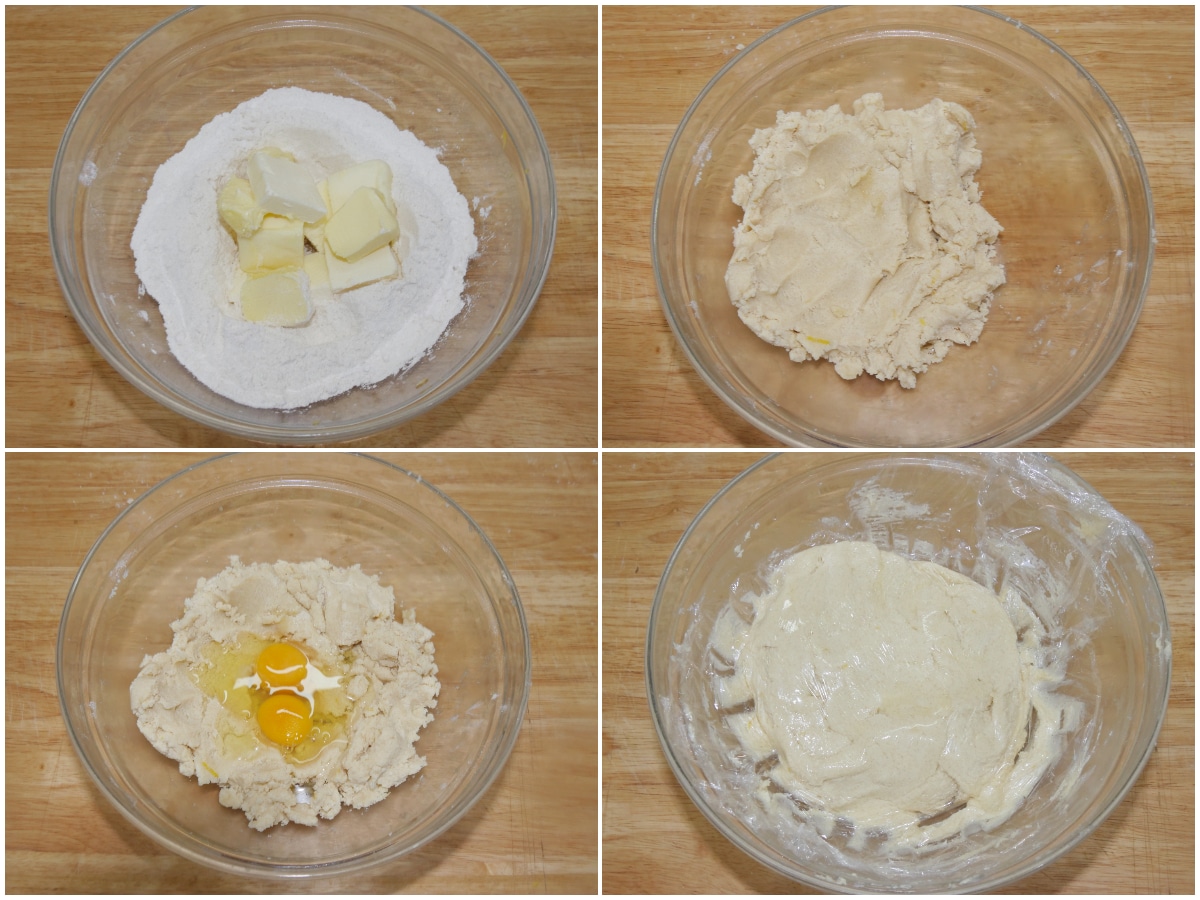 Unite zucchero, farina, buccia di limone e lievito in una ciotola, aggiungete il burro e iniziate a lavorare, quindi incorporate anche le uova: otterrete un composto molto morbido e appiccicoso, un po' una via di mezzo tra una frolla vera e la pastella di una torta.