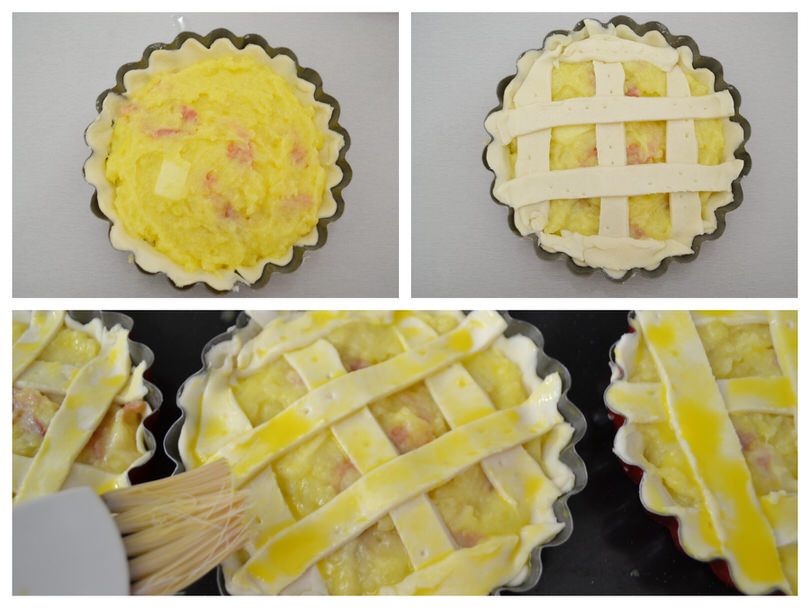 Versate il composto di patate ottenuto sulla sfoglia. Con una rotellina ricaviamo dalla pasta sfoglia avanzata delle striscioline e mettiamole incrociate sulle nostre crostatine. Spennellate con un uovo batuto la superficie della soglia e cuocete in forno già caldo a 200° per 15/20 minuti.
