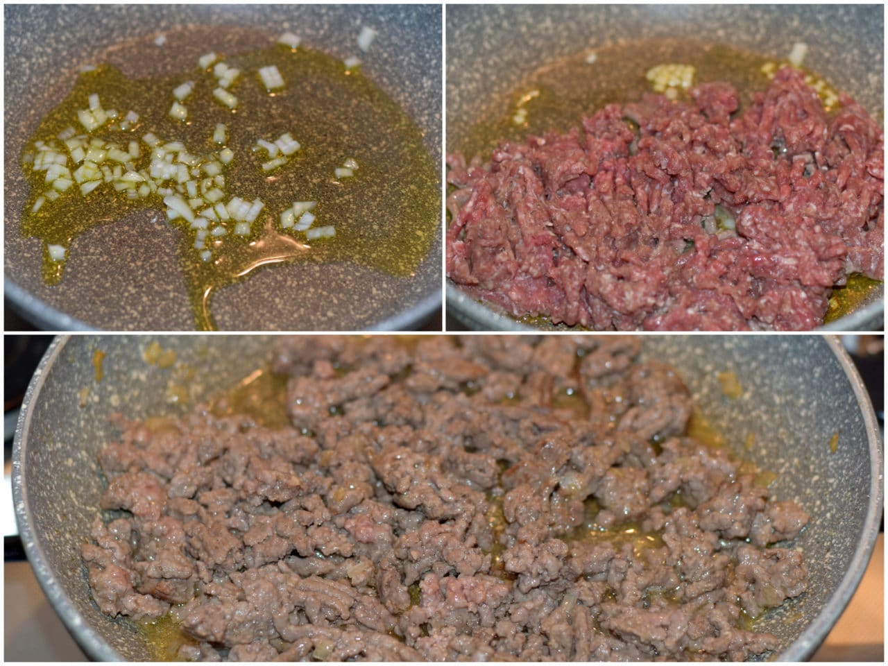 Tritate la cipolla e fatela dorare in un'ampia padella antiaderente con dell'olio, poi unite il macinato e lasciatelo insaporire, quindi sfumate con il vino.