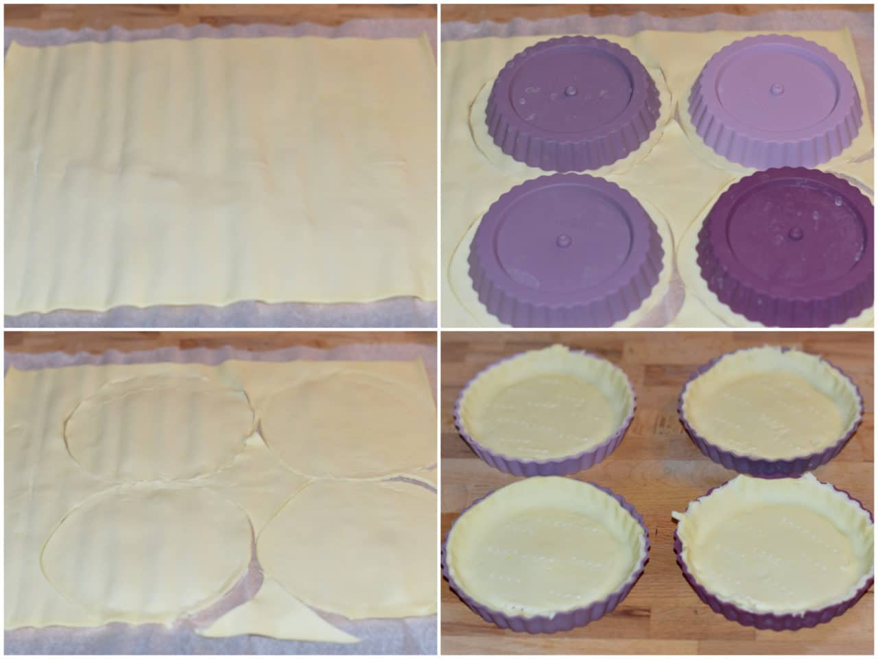 Srotolate la pasta sfoglia, disponeteci sopra gli stampini (senza pigiare) e ricavate dei cerchi leggermente più grandi degli stampini stessi.
