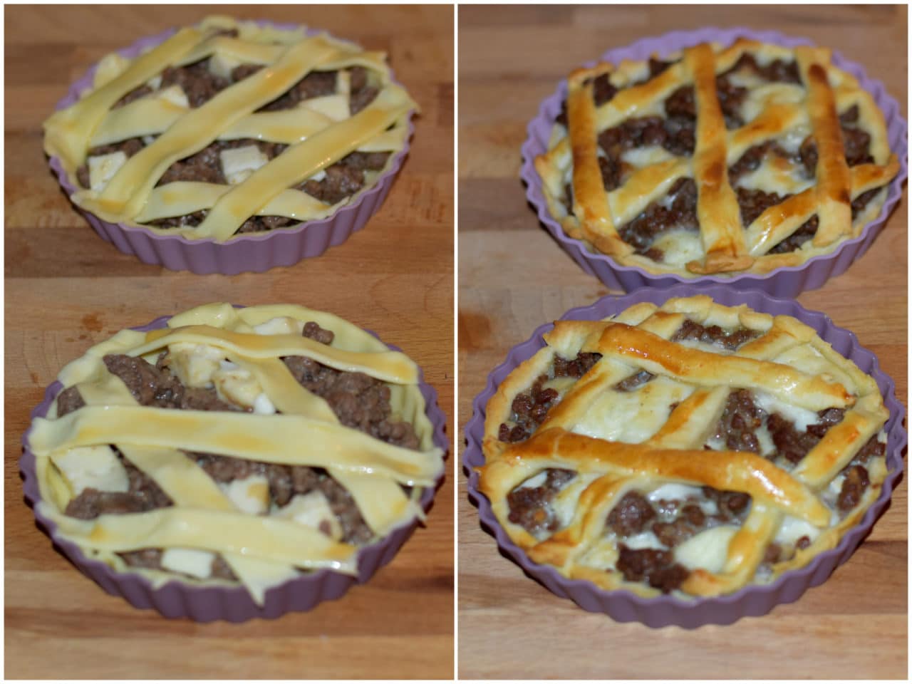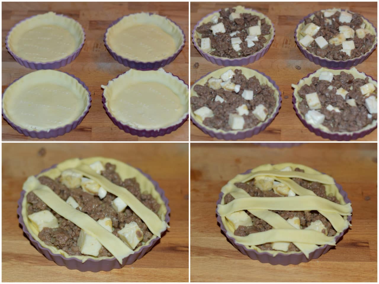 Distribuite il ripieno (macinato e cubetti di mozzarella) nei gusci di sfoglia e, con gli avanzi, create delle striscioline con cui decorerete la superficie creando un motivo a losanghe.