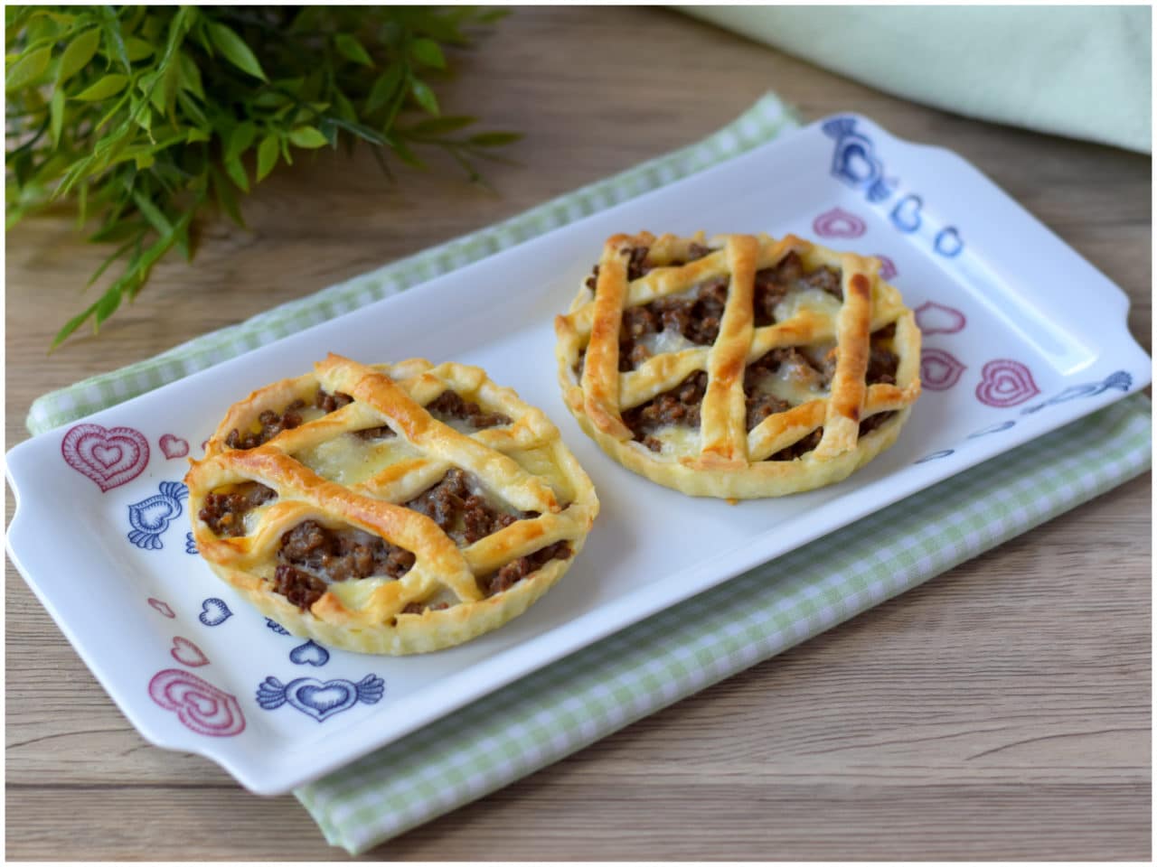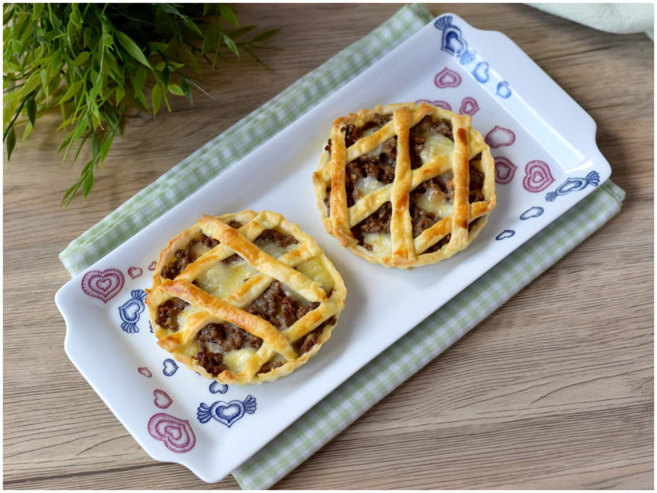 Le crostatine ripiene di carne e mozzarella sono pronte, lasciatele appena intiepidire prima di servirle.