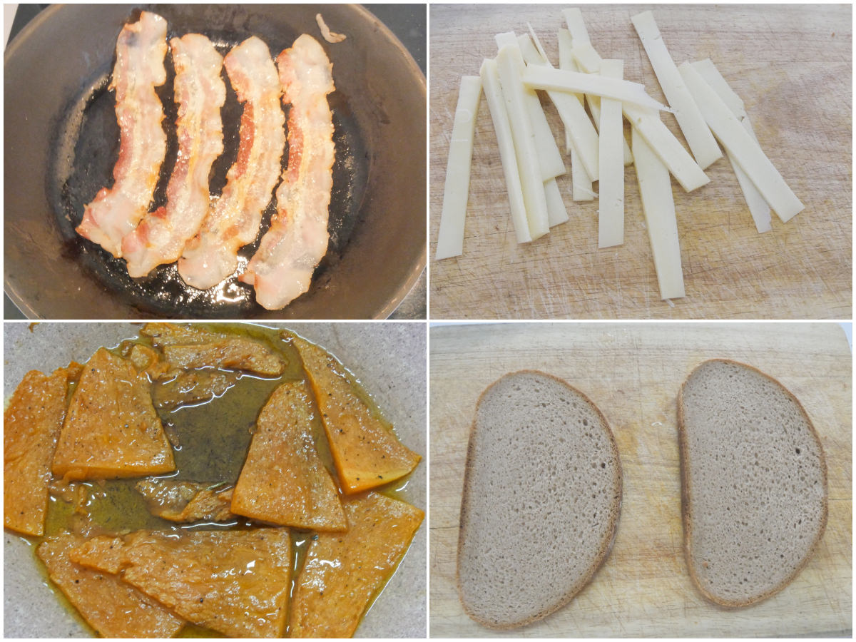 Nel frattempo rosolate la pancetta in una padella antiaderente (senza olio) e tagliate il formaggio a listarelle.