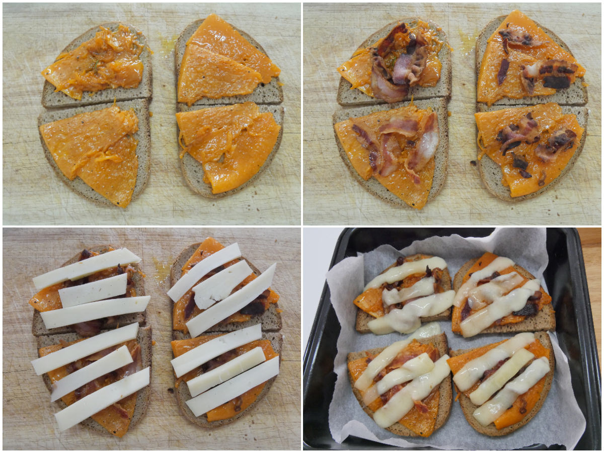 Assemblate i crostoni: tagliate le fette di pane a metà e farcitele con zucca, pancetta e formaggio, quindi disponetele in una teglia rivestita di carta forno e ripassatele per 3-5 minuti in forno ventilato preriscaldato al massimo e con grill acceso.