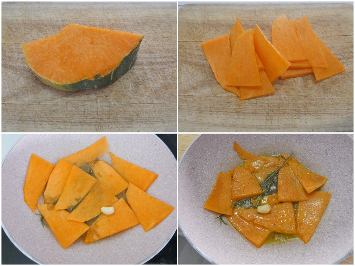 Innanzitutto lavate la zucca, mondatela, tagliatela a fettine sottili e cuocete in padella antiaderente con aglio, olio, rosmarino, sale e pepe, per 5-10 minuti (dovrà risultare cotta, senza arrivare a disfarsi).