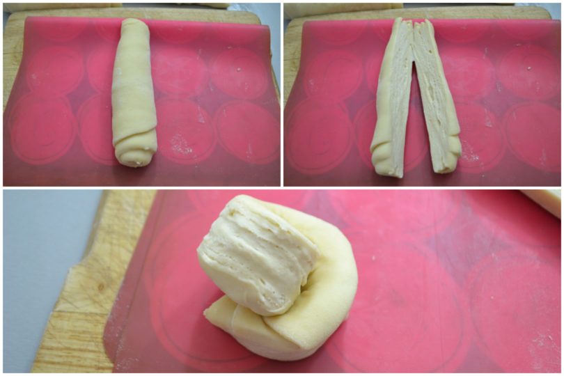 Arrotolate ogni metà mettendo il lato sfogliato verso l'esterno e formando una specie di chiocciola.