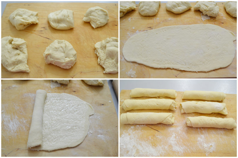 Trascorso il tempo di lievitazione dividete l’impasto in 6 parti e stendete ogni panetto in un rettangolo molto sottile.