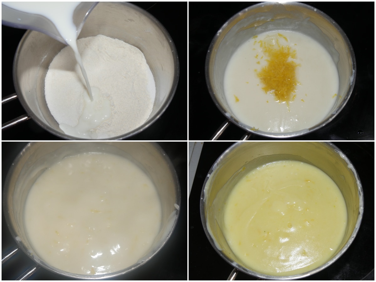 Innanzitutto preparate la crema: mettete farina e zucchero in un pentolino, incorporate il latte a filo mescolando costantemente per non far creare grumi, quindi unite succo e buccia di limone e cuocete fino a che la crema non sarà arrivata a ebollizione e non si sarà addensata.
