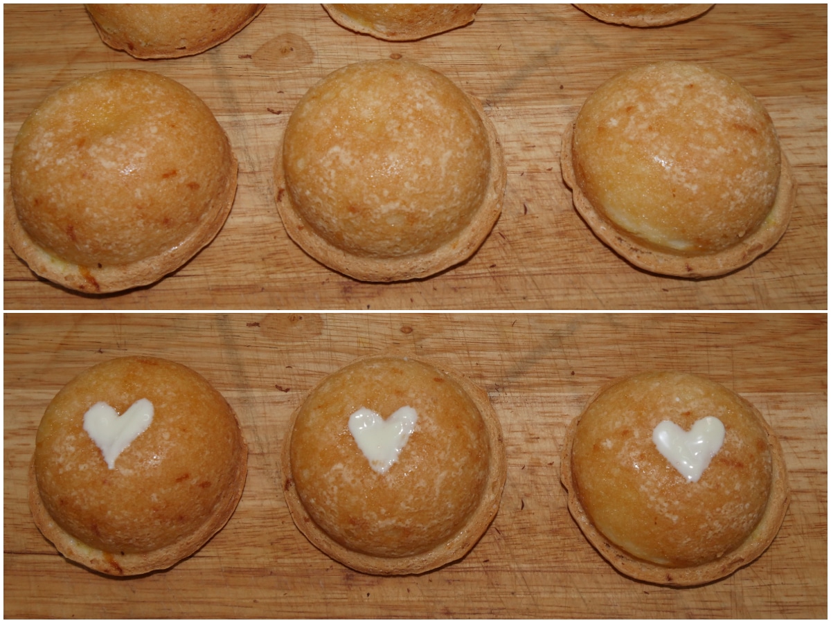 Lasciate raffreddare completamente prima di sformare le tortine, quindi sciogliete un po' di cioccolato bianco (nel microonde o a bagnomaria), versatelo in una sac-à-poche col beccuccio liscio e molto piccolo e disegnate dei cuoricini in cima alla cupola di ogni tortina.