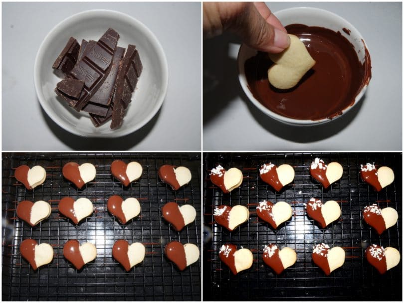 I cuori al cioccolato sono biscotti di pasta frolla alla vaniglia a forma di cuore che vengono poi intinti nel cioccolato per metà o interamente. Perfetti per accompagnare un tè seduti comodi sul divano, questi biscotti molto friabili e molto romantici sono l'ideale per una coccola pomeridiana. Fare i biscotti in casa per me è sempre una gioia e condividere i miei dolcetti con gli altri è il massimo della felicità. Oggi quindi condivido questi cuori al cioccolato offrendovene virtualmente uno.