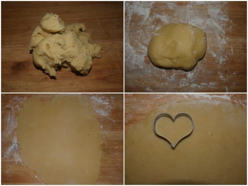 Riprendere l'impasto e stenderlo su una spianatoia infarinata ottenendo uno strato di 3 mm circa e ritagliare i biscotti con uno stampino a forma di cuore.