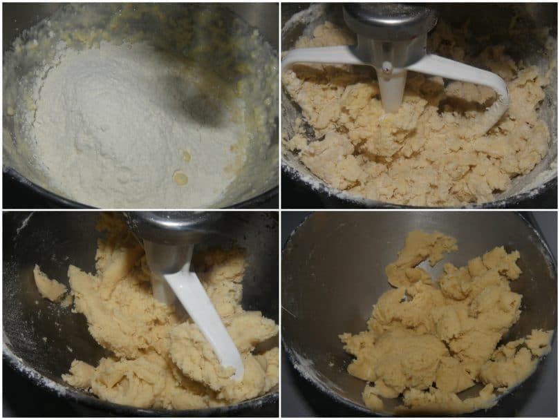 Aggiungete ora la farina e continuate ad impastare fino ad ottenere un impasto granuloso prima poi amalgamato.