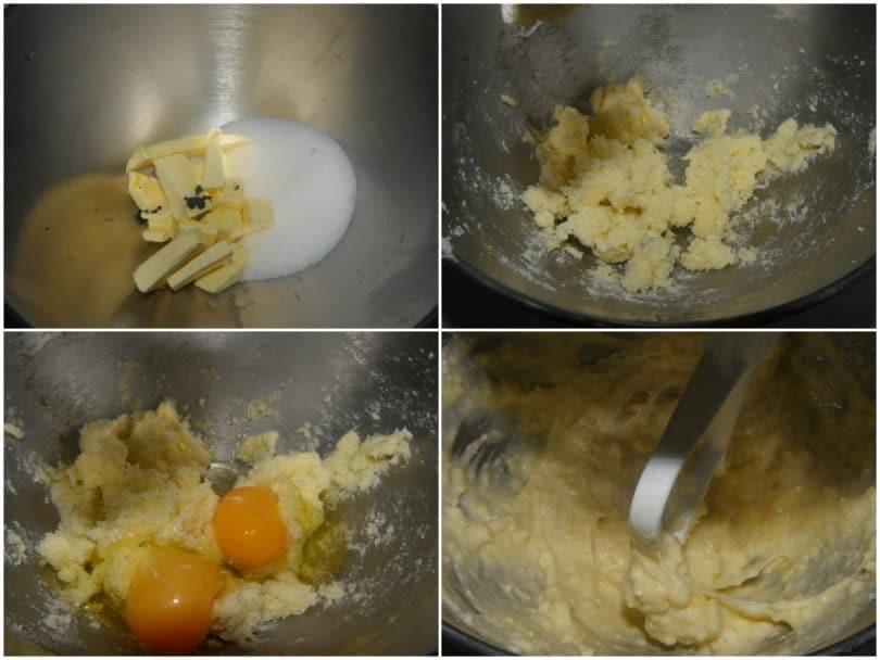 In una ciotola lavorare il burro ammorbidito con lo zucchero ed i semini di vaniglia fino ad ottenere una crema. Aggiungete l'uovo e continuate a lavorare.