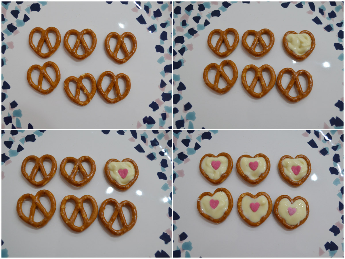Disponete i mini pretzel su un piatto (eventualmente potete rivestirlo di carta forno, se siete poco pratici e avete paura che possano attaccarsi alla superficie per via del cioccolato) e riempite l'interno di cioccolato, lasciando il bordo esterno a formare un cuoricino.
