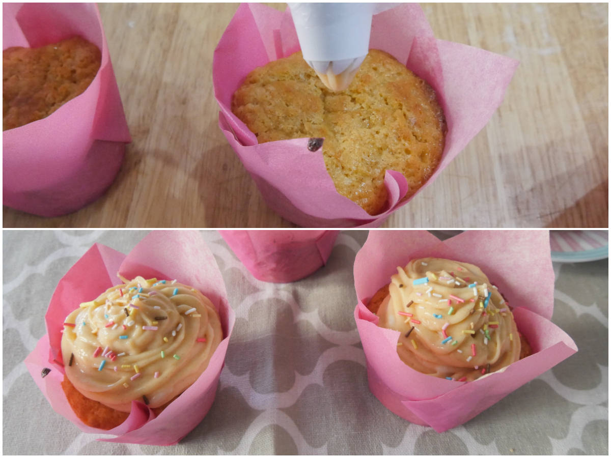 Quando le tortine saranno fredde, decoratele con il frosting (con una sac-à-poche con bocchetta a stella) e con le codette di zucchero.