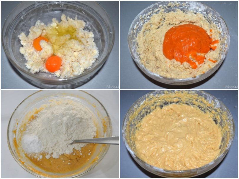 Nel frattempo lavorate il burro con lo zucchero e il sale fino ad ottenere una consistenza a pomata, quindi unite le uova, la zucca (solo 1 delle 2 ciotoline) stemperata con il latte e la cannella.