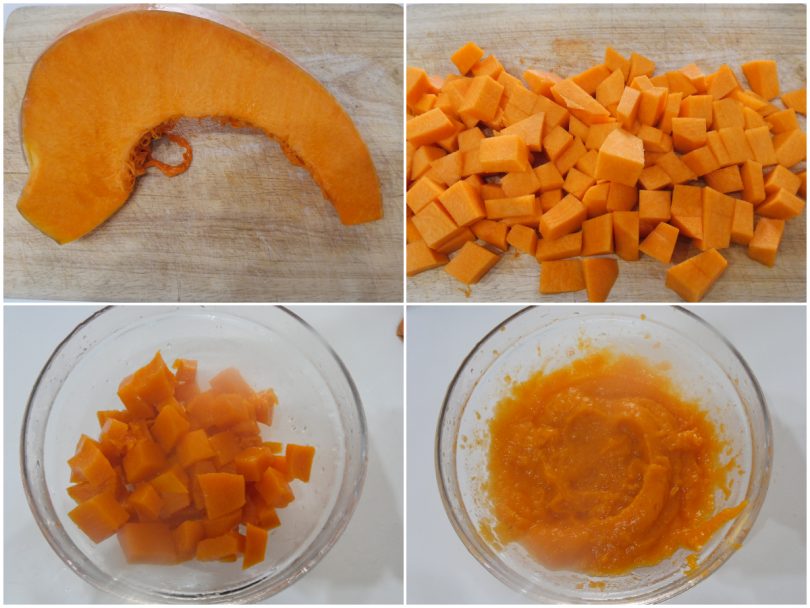 Innanzitutto pulite tutta la zucca, tagliatela a dadini, cuocetela per circa 10 minuti al microonde (o per almeno 20 minuti in pentola, con acqua), frullatela, dividetela in 2 coppette uguali (metà vi servirà per l'impasto e metà per il frosting) e lasciatela raffreddare.