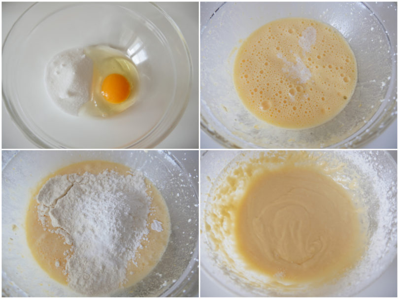 Innanzitutto sbattete bene l'uovo con lo zucchero, quindi aggiungete prima olio e yogurt, poi farina e lievito setacciati.