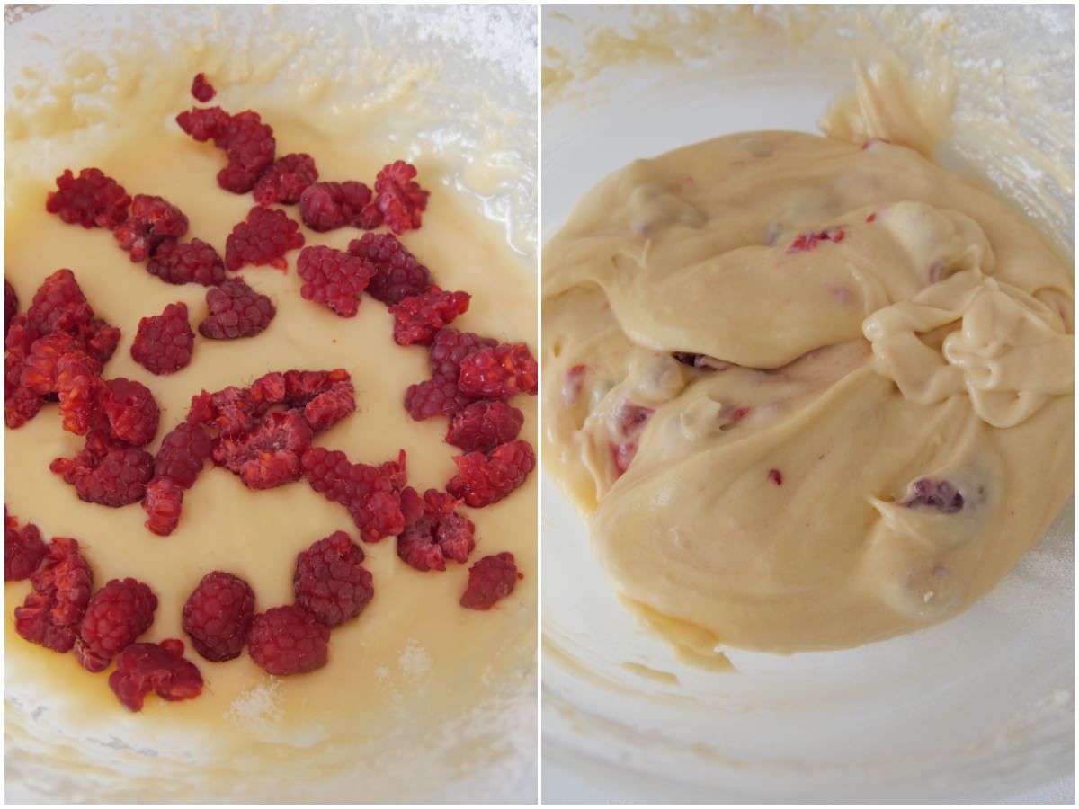 Infine, quando il composto sarà ben amalgamato, incorporate delicatamente anche i lamponi, interi o a metà.
