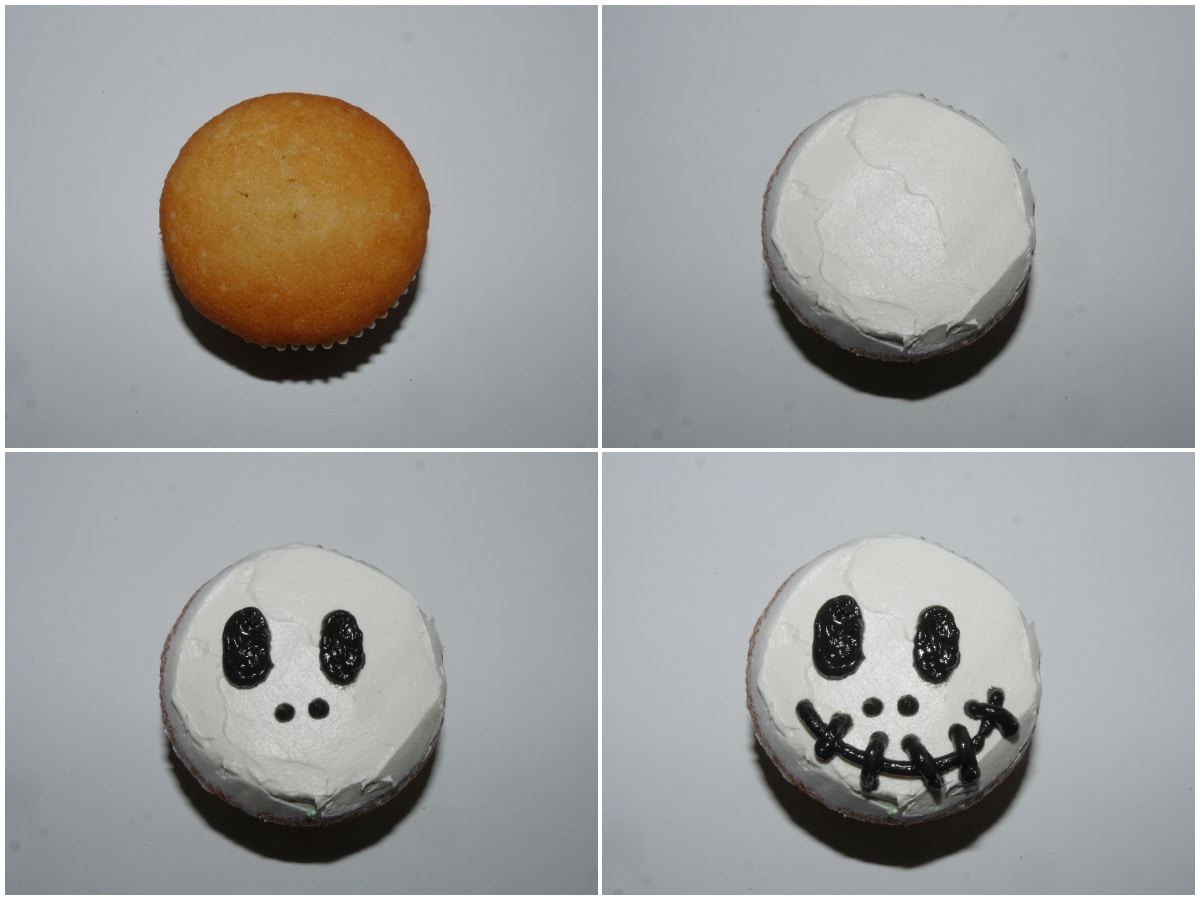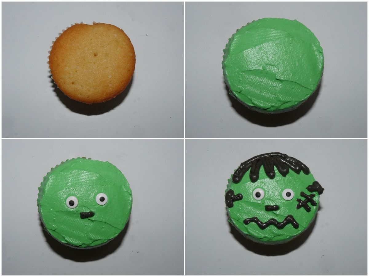 Dividete il frosting in varie ciotole e aggiungete del colorante alimentare in ognuno così da ottenere i colori necessari per le vostre decorazioni. Io ho realizzato zucche, frankestein, mummie e jack skeletron, ho quindi colorato con arancione, nero e verde.
