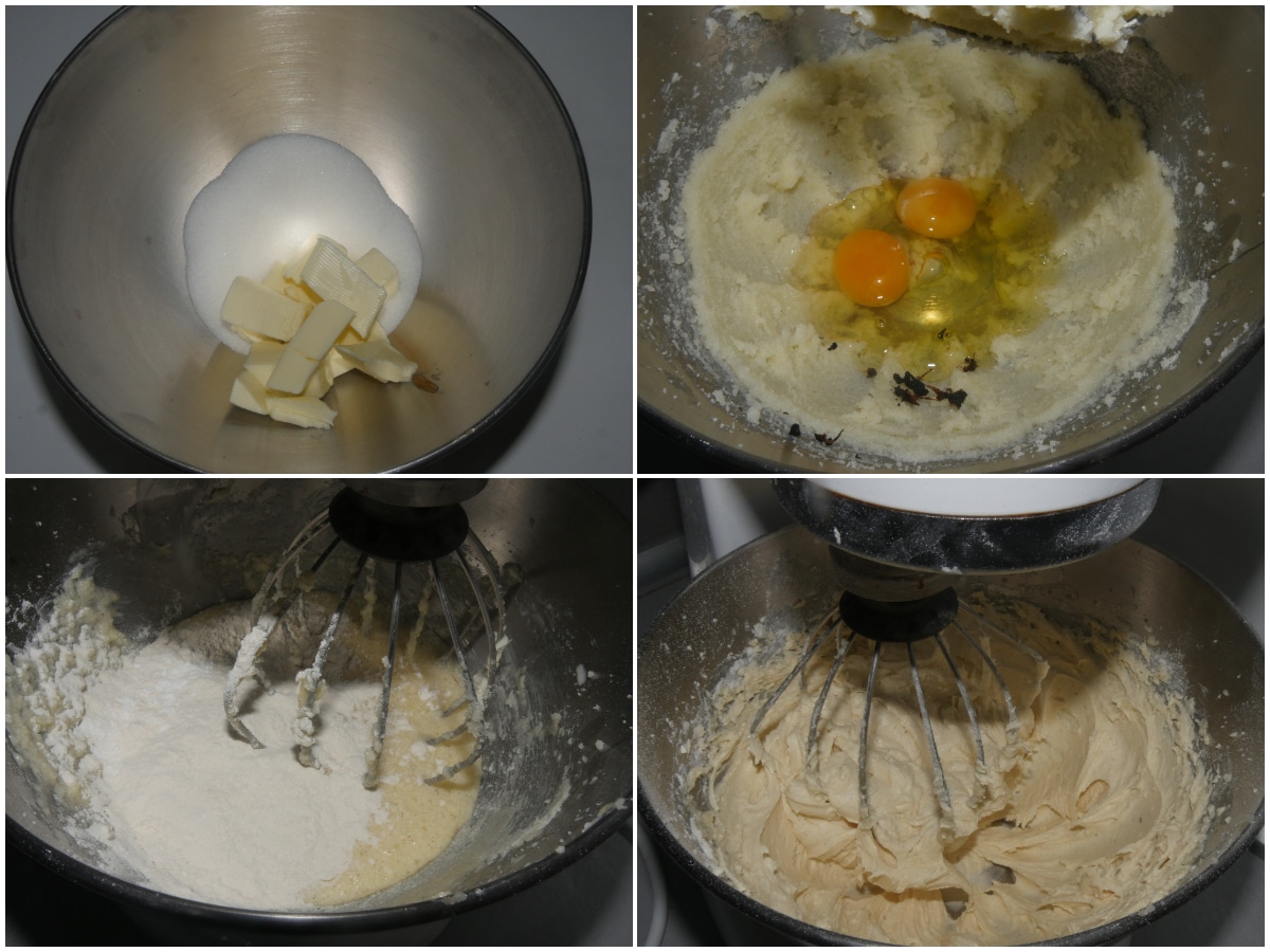 In una ciotola lavorate il burro ammorbidito insieme allo zucchero. Aggiungete le uova e mescolate. Incorporate il lievito, la vaniglia e la farina a pioggia e mescolate