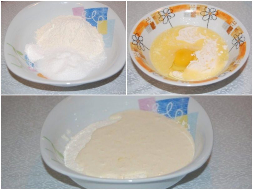In un'ampia ciotola mescolare la farina, lo zucchero, la vanillina e il lievito.A parte mescolare il burro sciolto con l'uovo e la panna (non montata).Unire gli ingredienti liquidi nei secchi e mescolare.