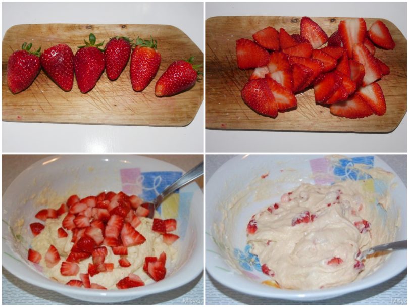 Lavare e tagliare a pezzettini le fragole e aggiungerle all'impasto.Mescolare delicatamente l'impasto dei muffin alle fragole.