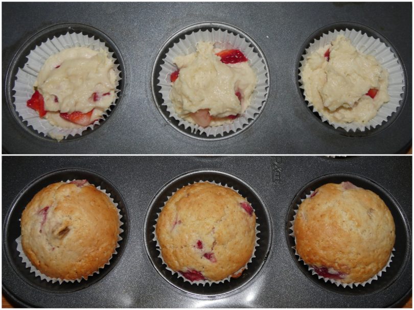 Versare l'impasto nei pirottini imburrati per la metà della loro altezzaInfornare i muffin panna e fragole a 180° e cuocere per 20 minuti.